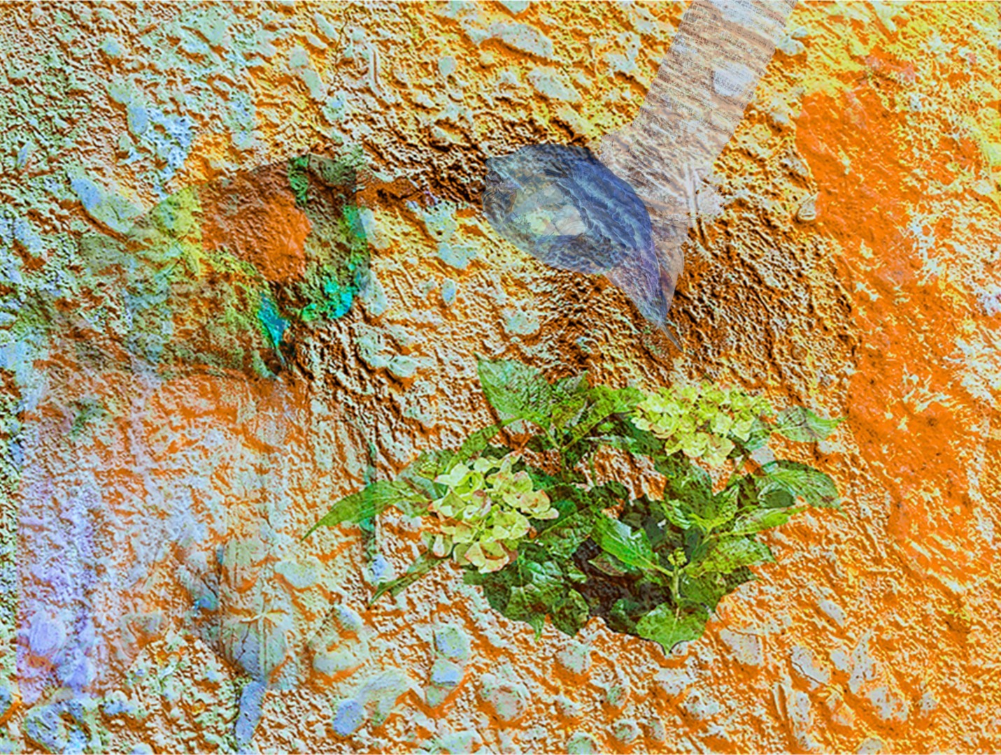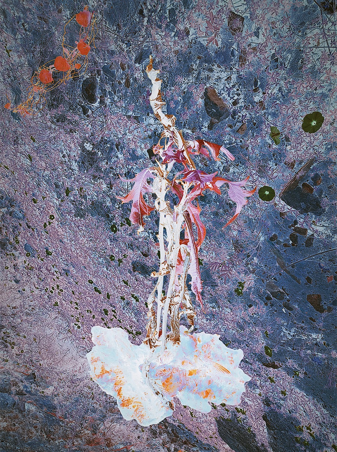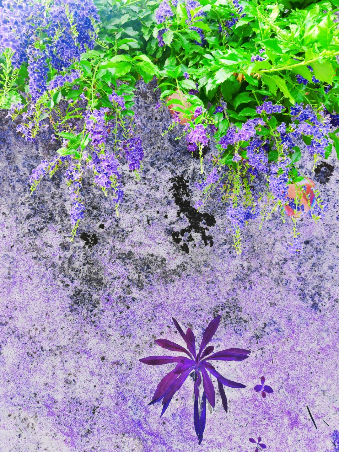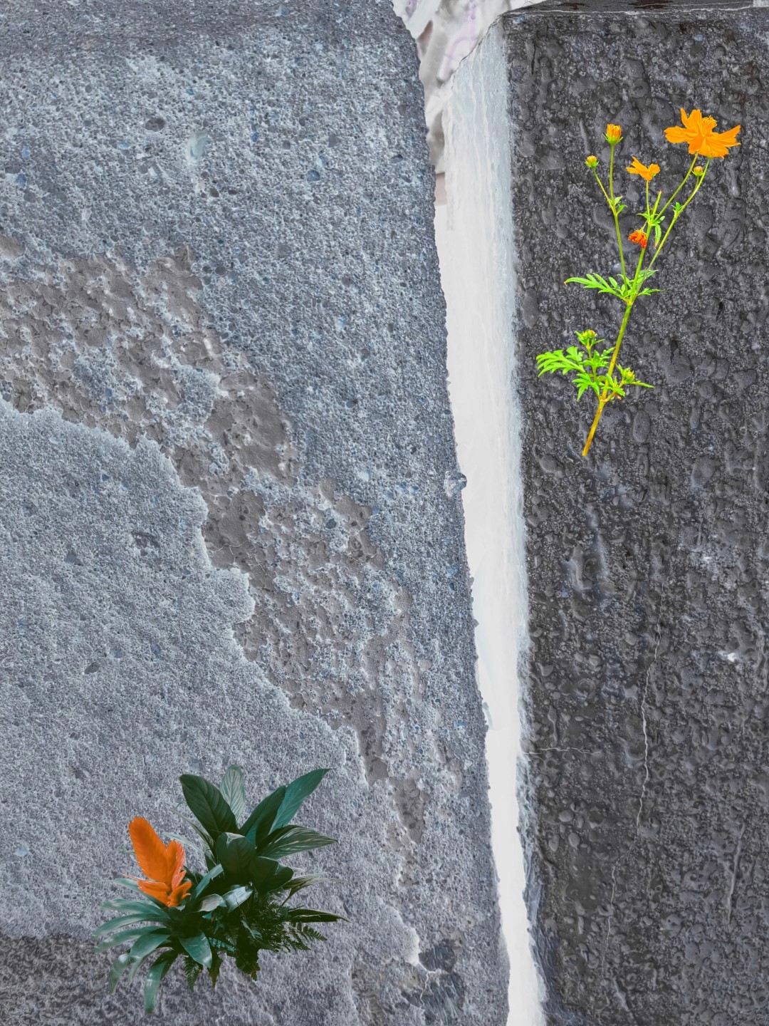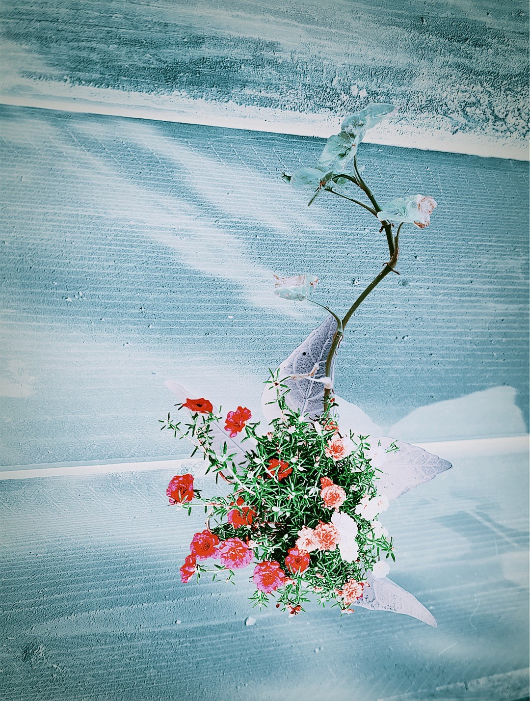 y-55 to y-59 "Fallen Leaves at Home": All five photos in "Fallen Leaves at Home" were taken on my home terrace. It was a day in the summer of 2022 when our community was suddenly locked down. All residents were forbidden to leave their homes except for daily nucleic acid testing at a designated time and place. A neighbor, whose house was separated from mine by one building, couldn't even go downstairs for the test. The occurrence of this event was without any notification or announcement. Neighbors could only guess that a positive case was detected in the building that couldn't go downstairs for the test. The lockdown of the community has happened many times in the city where I live, so I was very calm during the first three days. When I went downstairs for the test and waited in line, I would sneak pictures of the flowers planted by my neighbors (the control staff did not allow us to take pictures, fearing cross-contamination). We spent three peaceful days like this, and everyone's test results were negative.