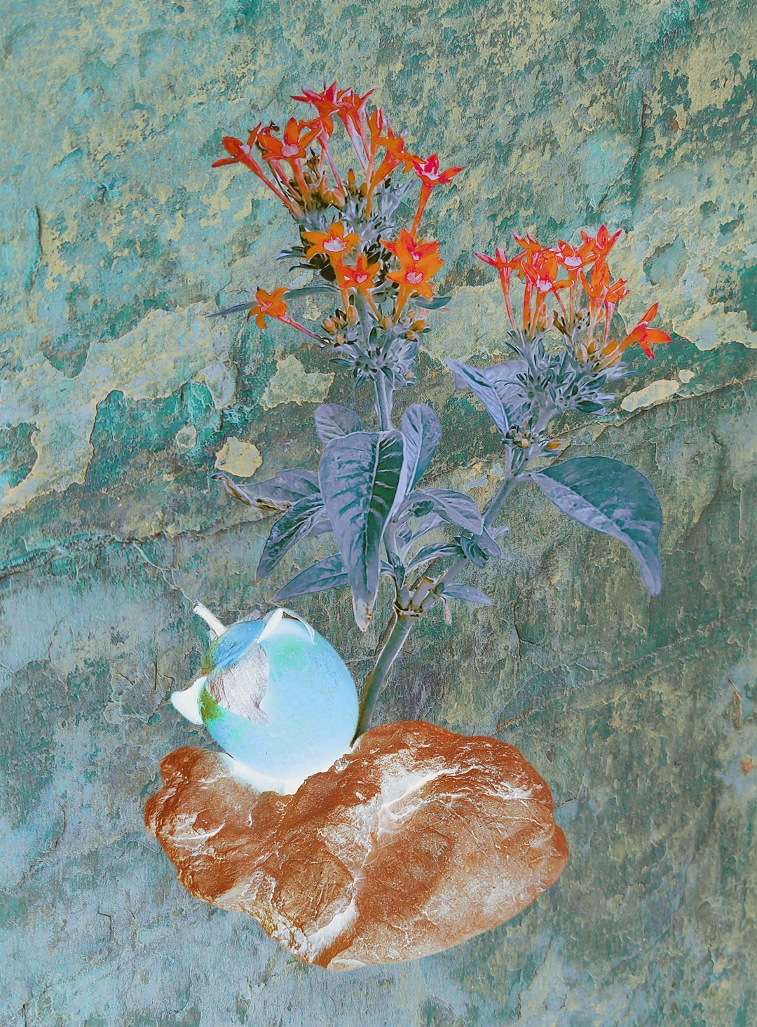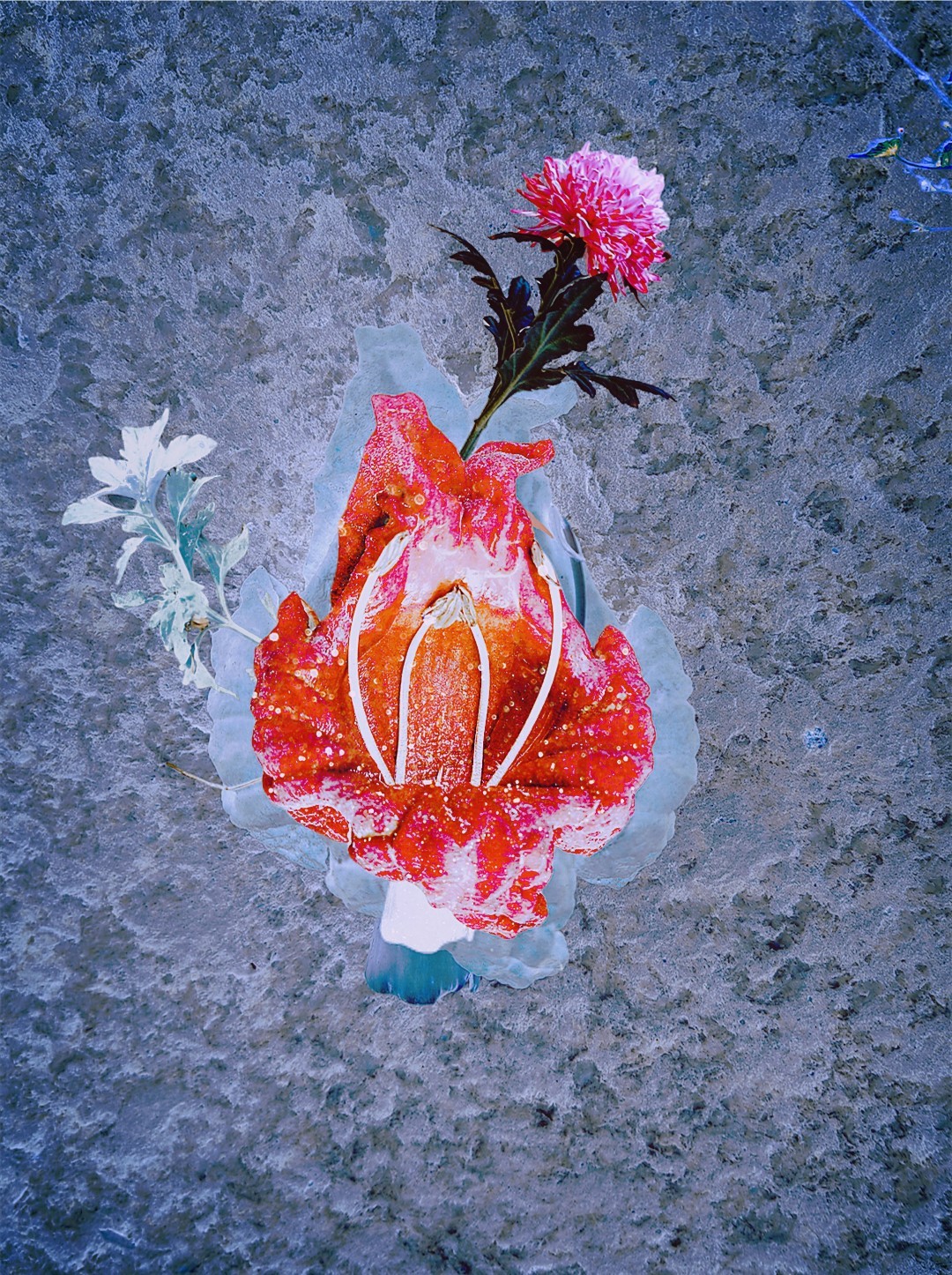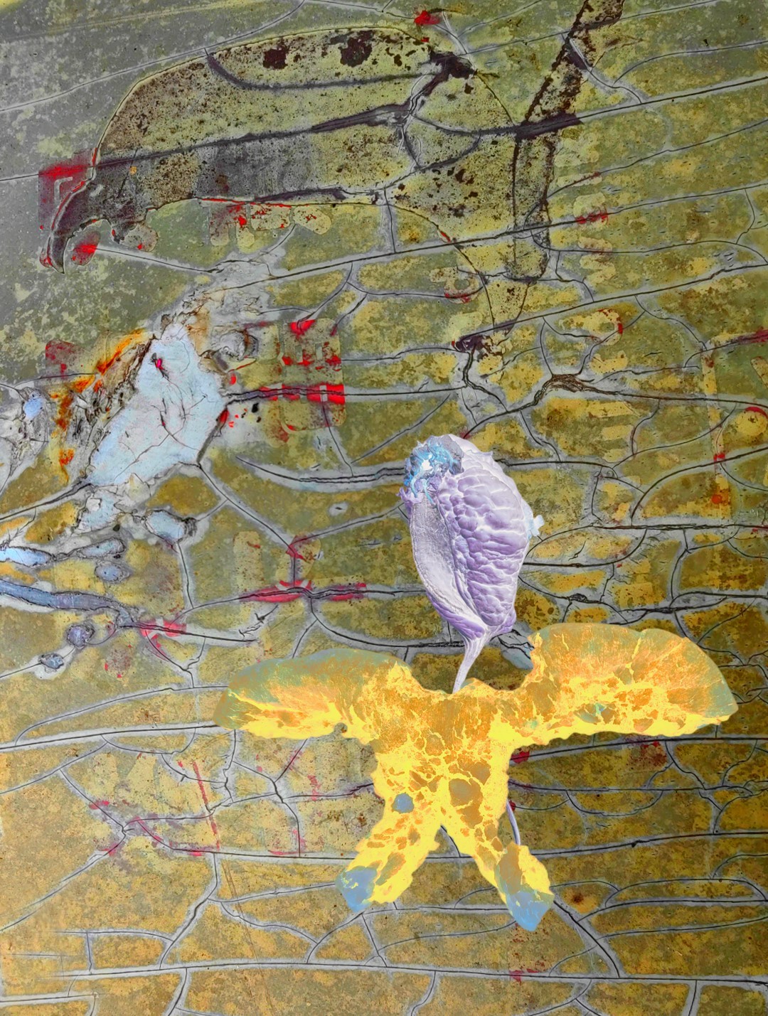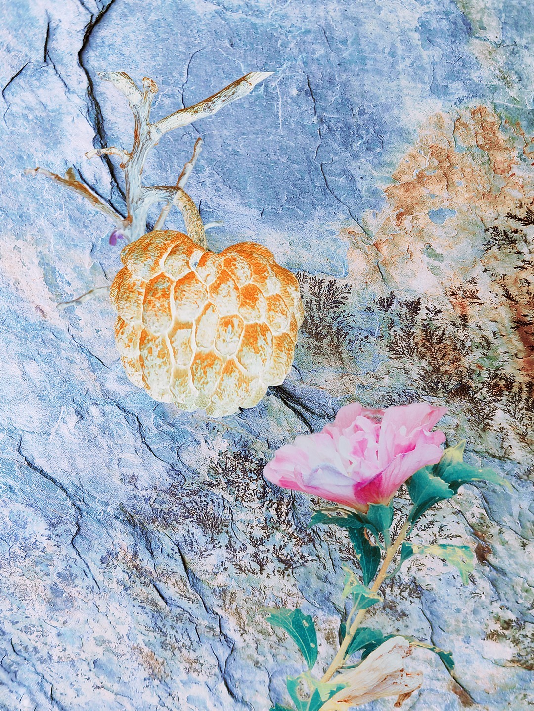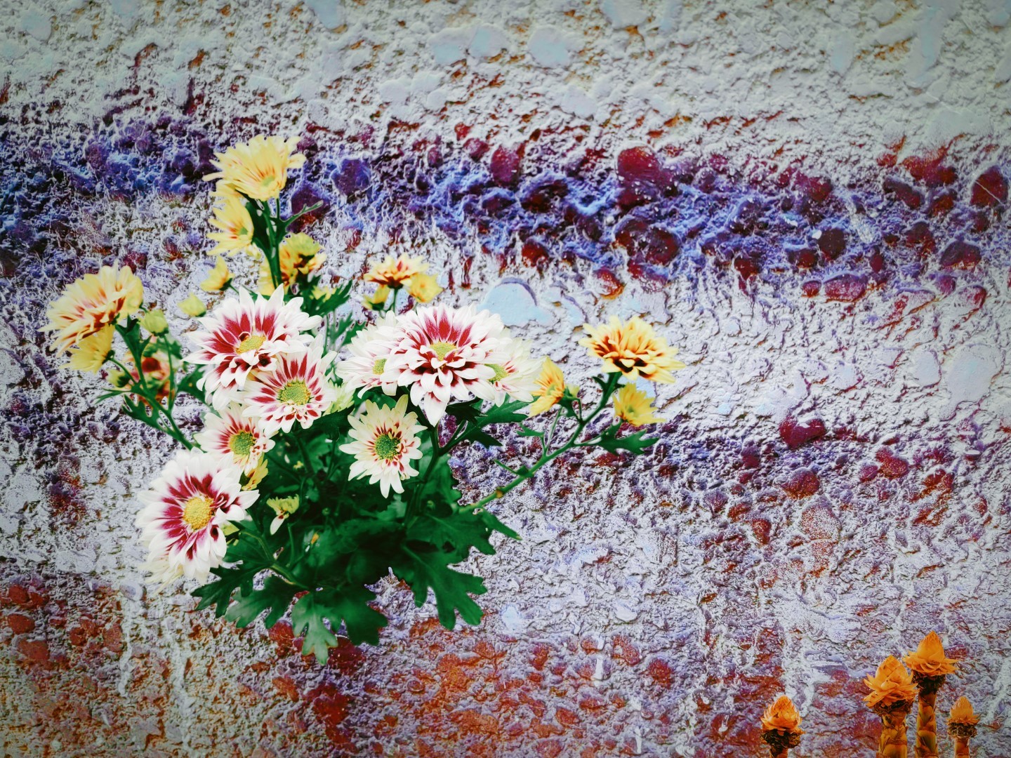 y-55 to y-59 "Fallen Leaves at Home": All five photos in "Fallen Leaves at Home" were taken on my home terrace. It was a day in the summer of 2022 when our community was suddenly locked down. All residents were forbidden to leave their homes except for daily nucleic acid testing at a designated time and place. A neighbor, whose house was separated from mine by one building, couldn't even go downstairs for the test. The occurrence of this event was without any notification or announcement. Neighbors could only guess that a positive case was detected in the building that couldn't go downstairs for the test. The lockdown of the community has happened many times in the city where I live, so I was very calm during the first three days. When I went downstairs for the test and waited in line, I would sneak pictures of the flowers planted by my neighbors (the control staff did not allow us to take pictures, fearing cross-contamination). We spent three peaceful days like this, and everyone's test results were negative.