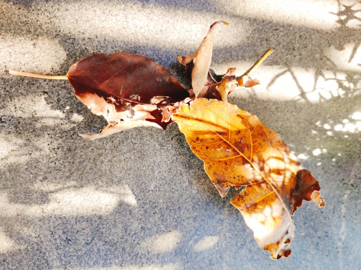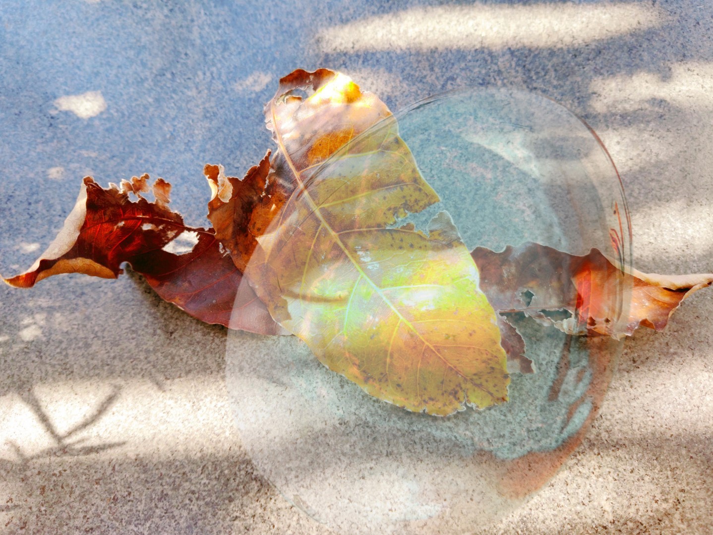 After watching my neighbors being "escorted" away, I couldn't sleep anymore. I sat alone on the terrace, seeing a lot of fallen leaves scattered on the ground from the tree the bird planted for me (a tree that grew naturally, not one I purchased). The sunlight shone through the railing and cast onto the fallen leaves, creating an exceptionally serene atmosphere, which strongly contrasted with my state of mind. So, I took pictures of these beautiful moments with my phone and turned them into images to serve as my tranquillizers, as I was genuinely afraid of being transferred to some filthy place at any moment. I was worried that my fragile nervous and immune systems would make me seriously ill due to the inability to adapt. In the end, we neither received any explanation nor were transferred, but I still fell ill after the lockdown was lifted due to excessive tension.